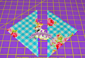 Line up the top triangle with the bottom triangle at the point. Do not worry about the excess on the sides we will trim up the block to 12 1/2 inches.